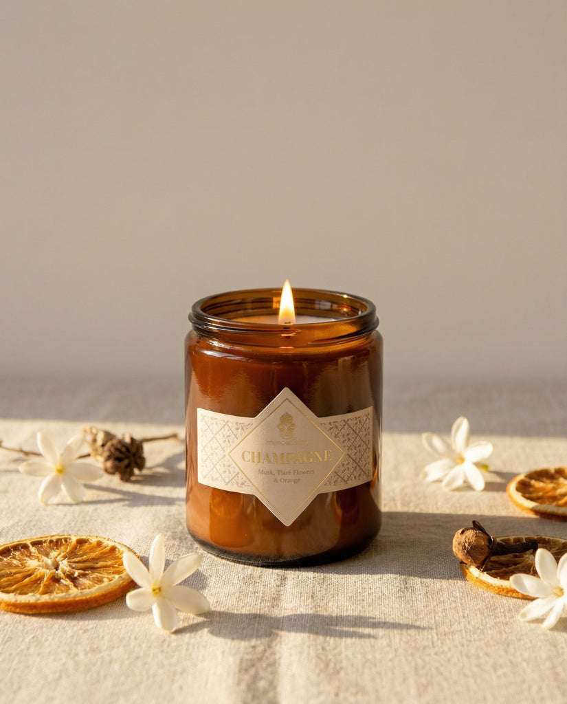 Champagne is a sparkling, radiant fragrance that blends bright orange, and delicate white and tiaré flowers, softened with vanilla, jasmine, and warm musk—a scent that celebrates joy, elegance, and effervescent femininity.