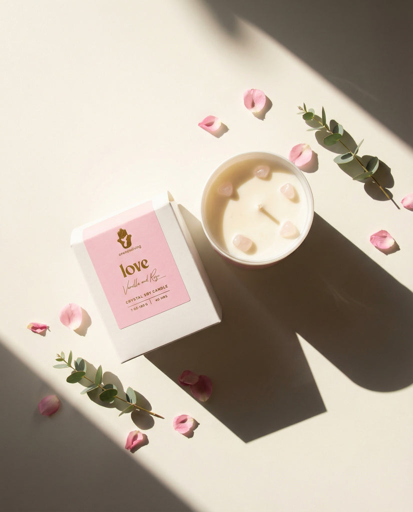 Hand poured soy wax candle infused with rose quartz crystals. It has a soothing scent of rose and vanilla.